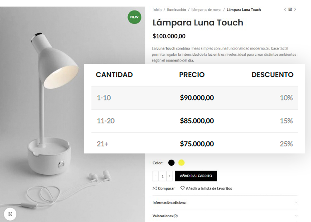 Además, podemos configurar que tus clientes se beneficien del precio mayorista cuando agregar a su carrito un mínimo de x unidades / productos, o cuando su carrito de compras supere un monto mínimo establecido.
